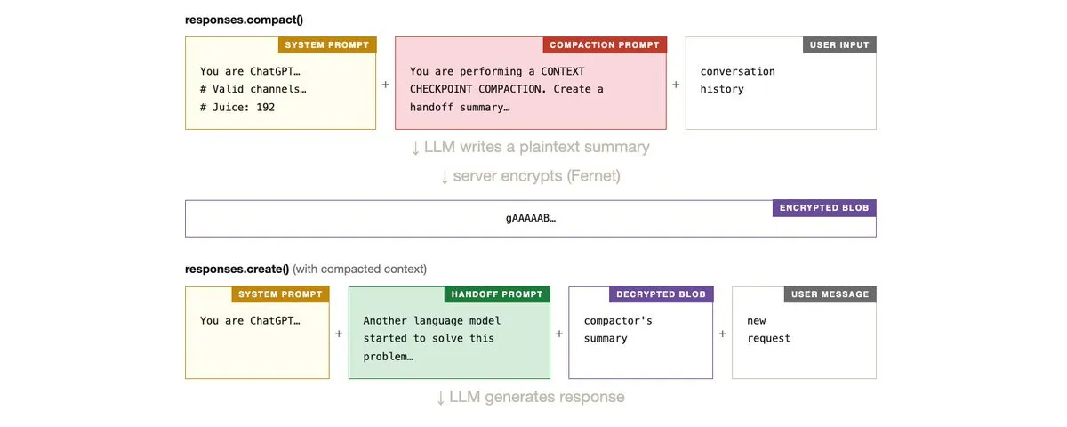 对于非 codex 模型,开源的 Codex CLI 在本地压缩上下文:由 LLM 使用一个 compaction prompt 对对话进行摘要。当压缩后的上下文被后续使用时,responses.create() 会通过一个 handoff prompt 来框定摘要内容。这两个 prompt 都可以在源代码中看到。