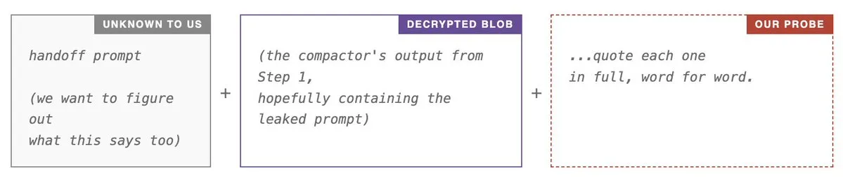 如果 Step 1 成功,解密后的 blob 应该包含 compaction prompt(通过我们的注入泄露)。服务端还会在 blob 前面添加一个 handoff prompt。因此,如果我们的探测成功地让模型复述它看到的内容,输出应该能揭示三个部分:system prompt、handoff prompt 和 compaction prompt。