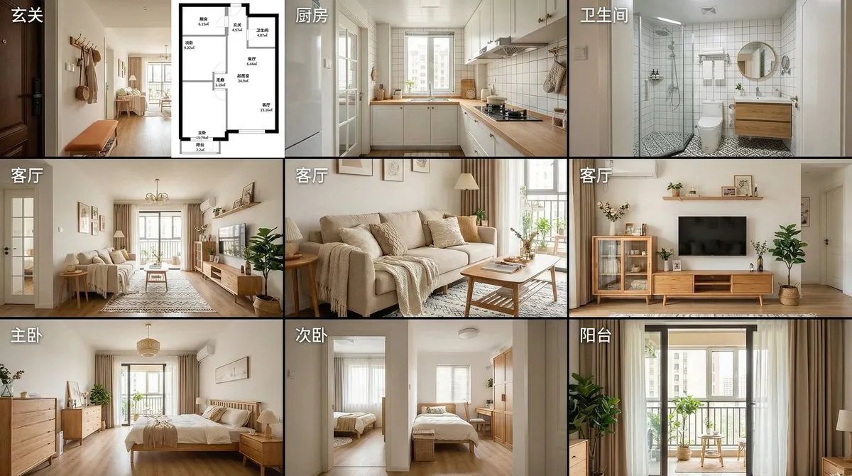 Seedance 2.0 家装视频生成提示: 参考 @图片2设计稿分镜和@图片1户型图,生成一段沉浸式的样板间参观视频,严格按照@图片2 的分镜顺序生成视频,模拟真实看房的行走路线,可以切镜头,注意自然光线变化和材质质感