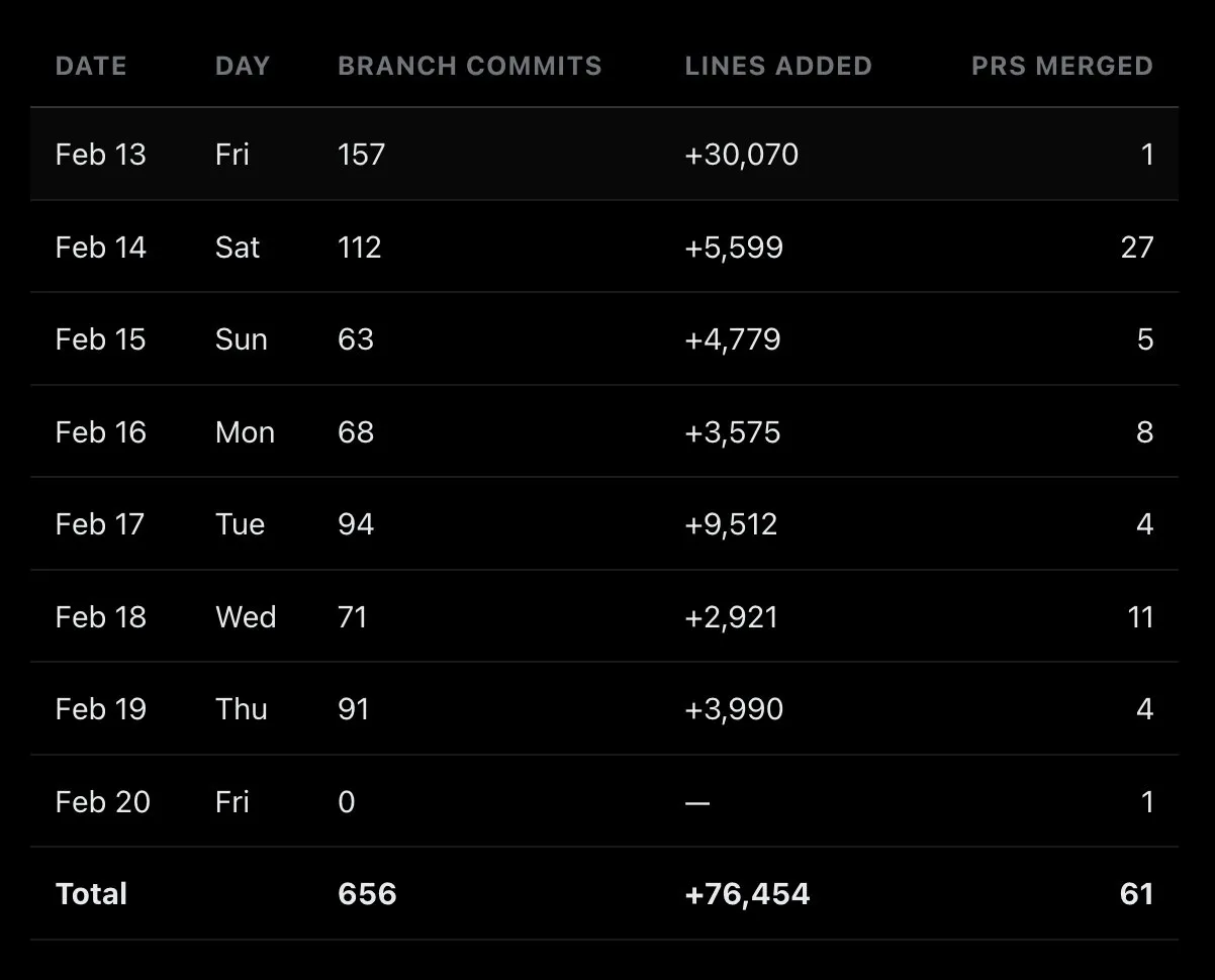 最高产的一天是 2 月 14 日周六。单日合并了 27 个 PR,整个平台就此成型——核心服务、CLI、Web 控制台、全部 17 个 plugin、npm 发布,全部搞定。我 review 和 merge PR 的速度快得自己都来不及细看,但每个 PR 都已经通过了 CI 和自动化 code review。