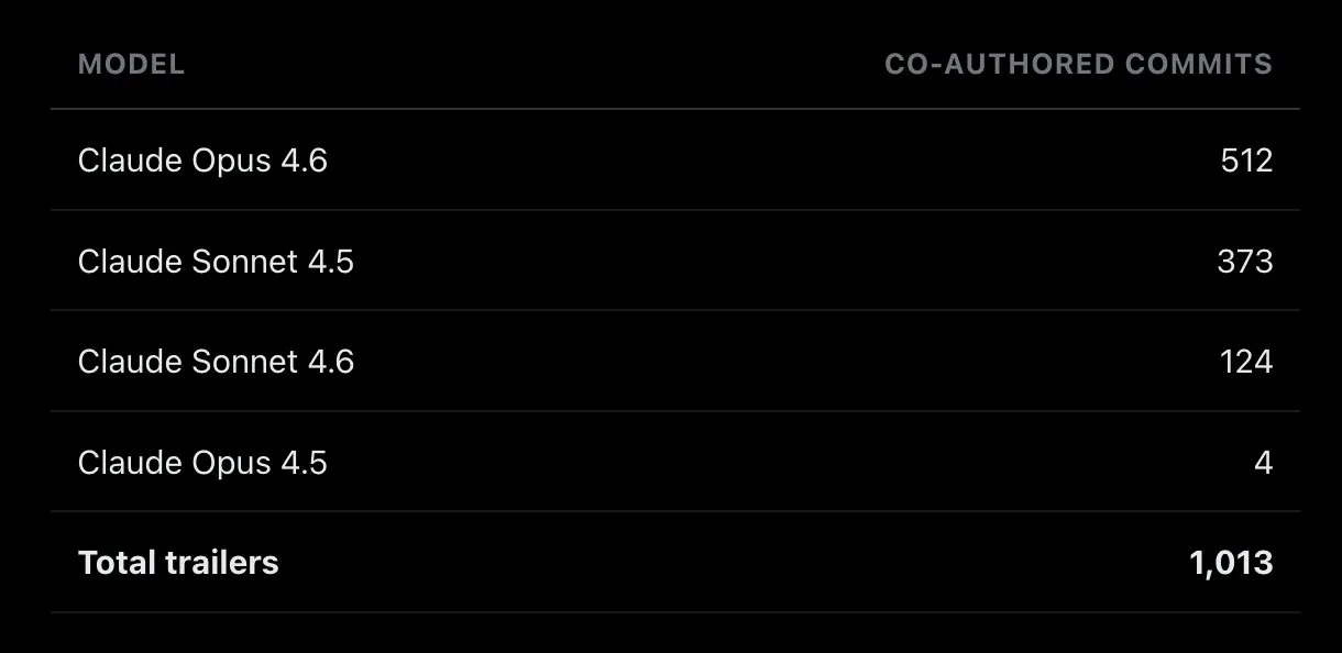 每次 commit 都通过 git trailers 记录了使用的模型: