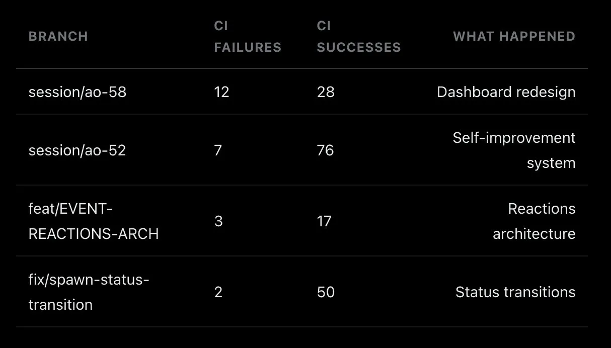 Agent Orchestrator 内置了一套自我提升系统(ao-52,它本身也是由 agent 构建的),会记录性能数据、追踪会话结果、并定期做复盘。它会学习哪类任务第一次就能成功,哪类任务需要更严格的约束。